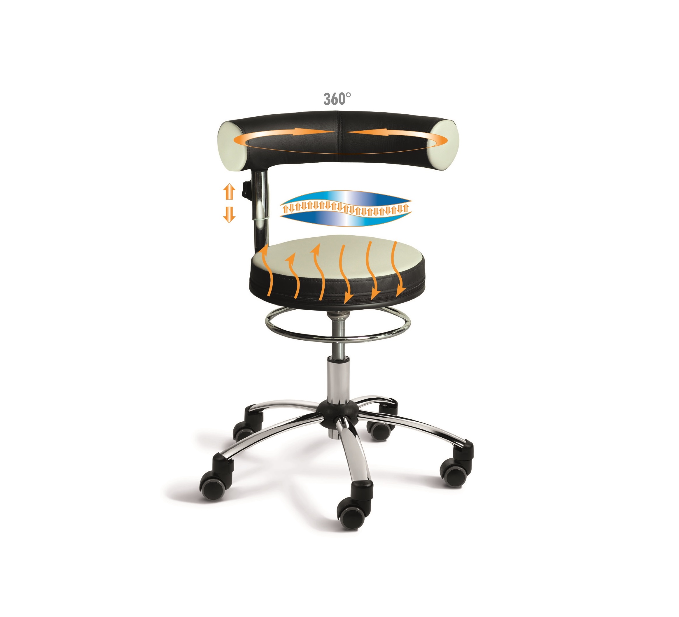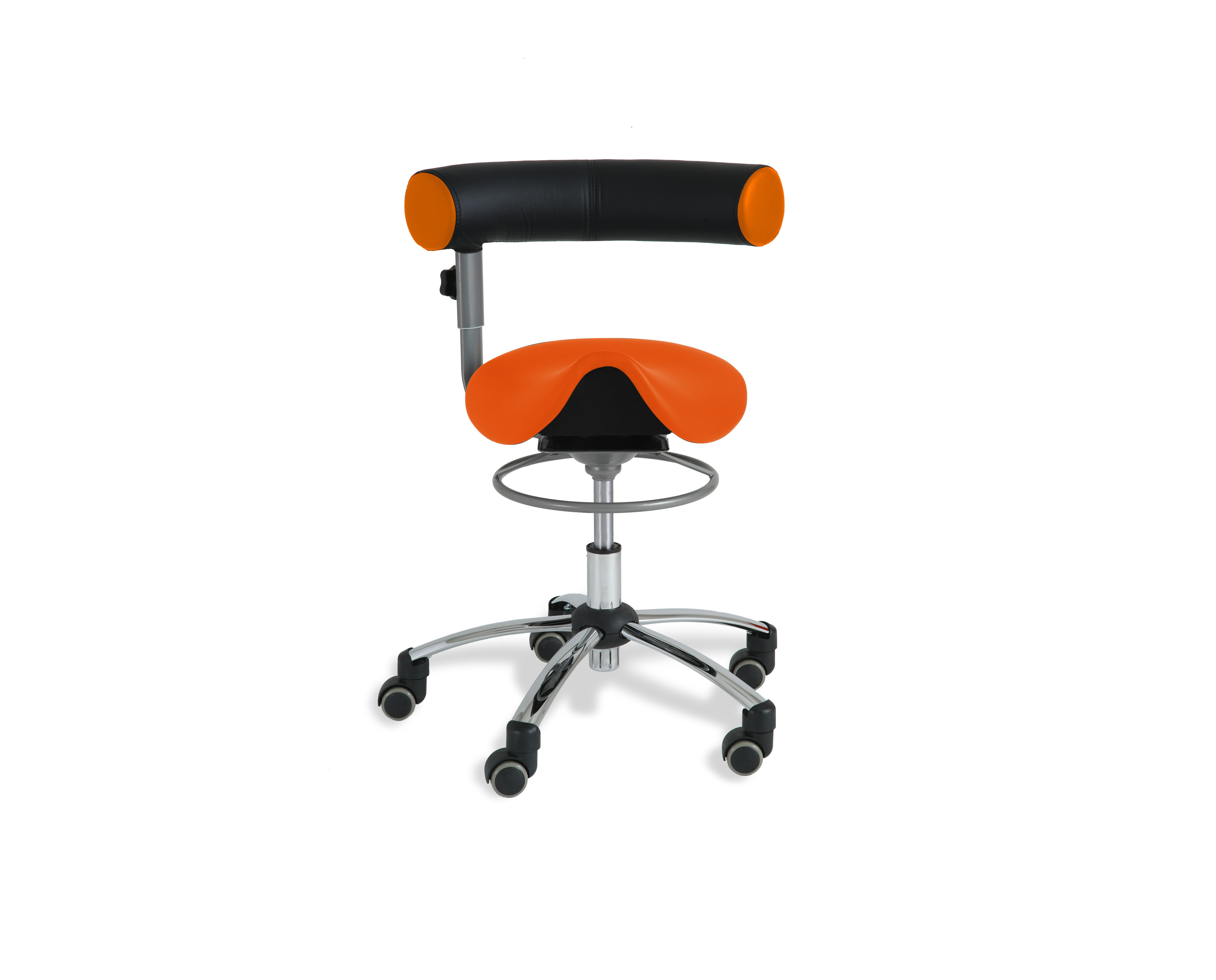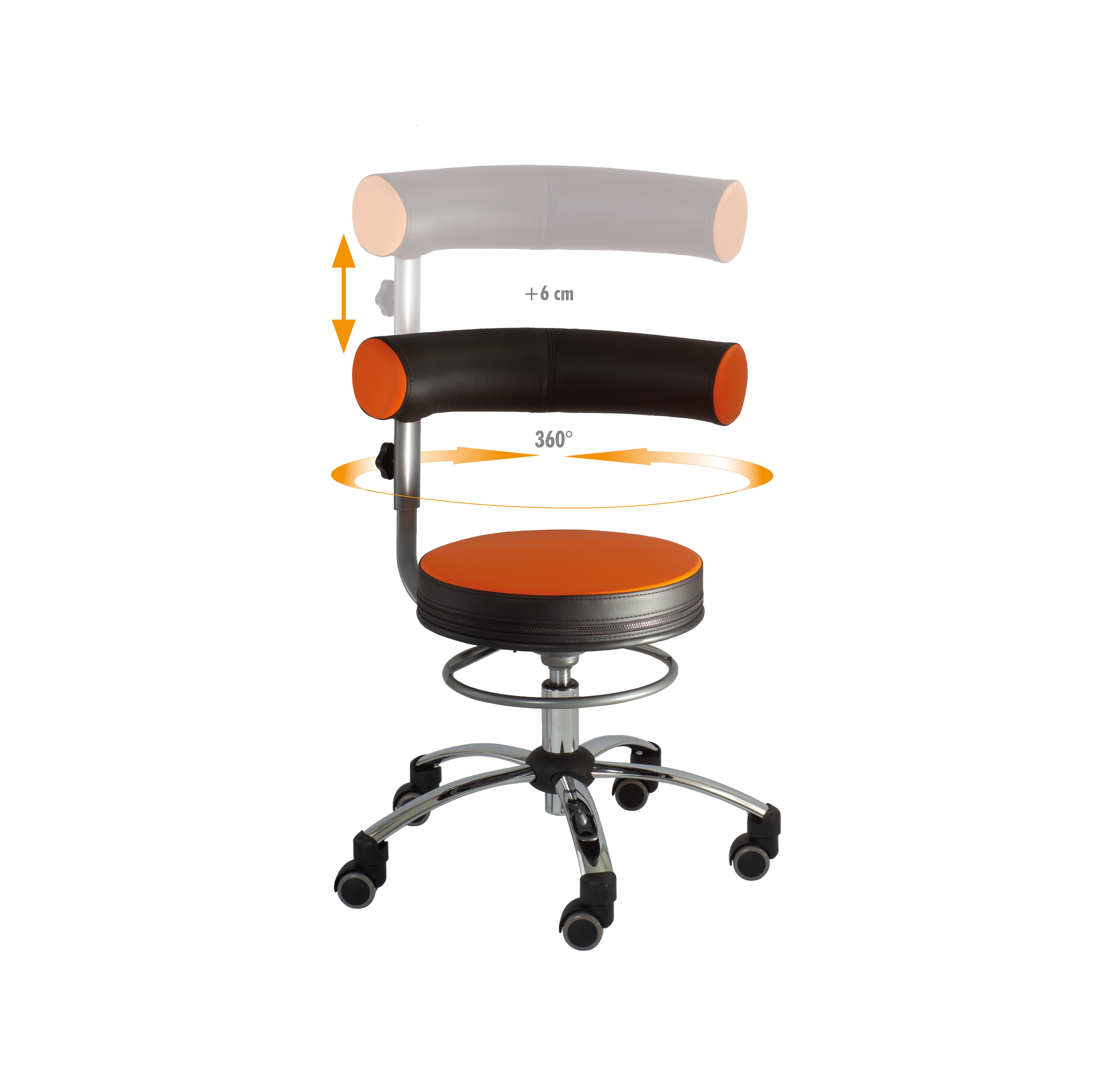 Der einzige Sattelsitz mit vollständig um den Körper drehbarer Lehne und praktischem Ring zur Höhenverstellung.